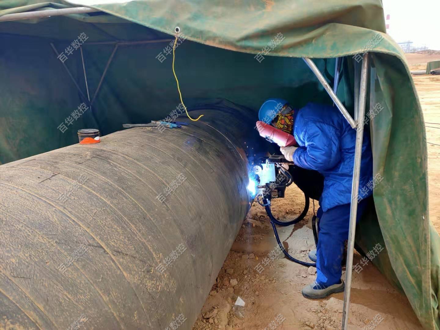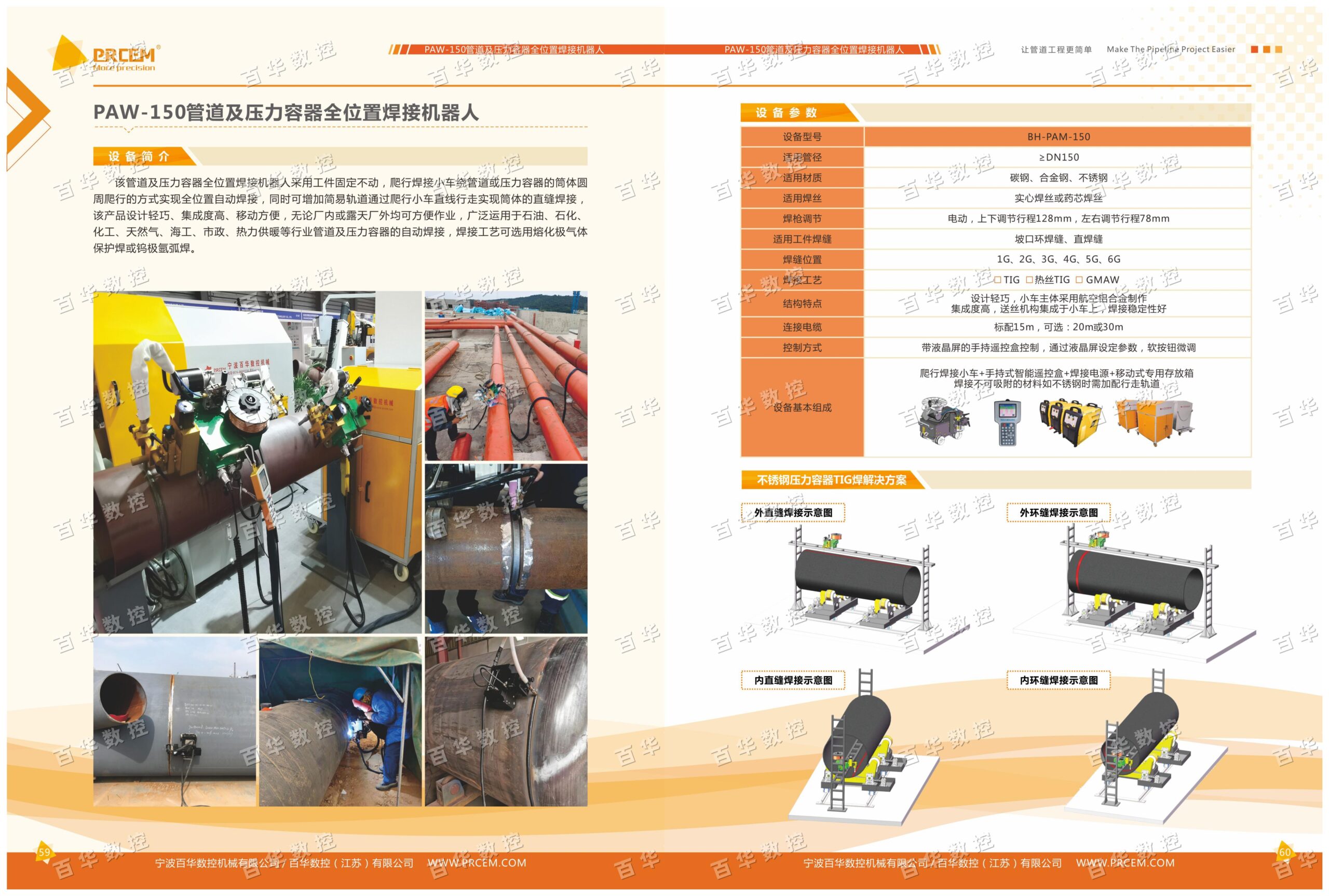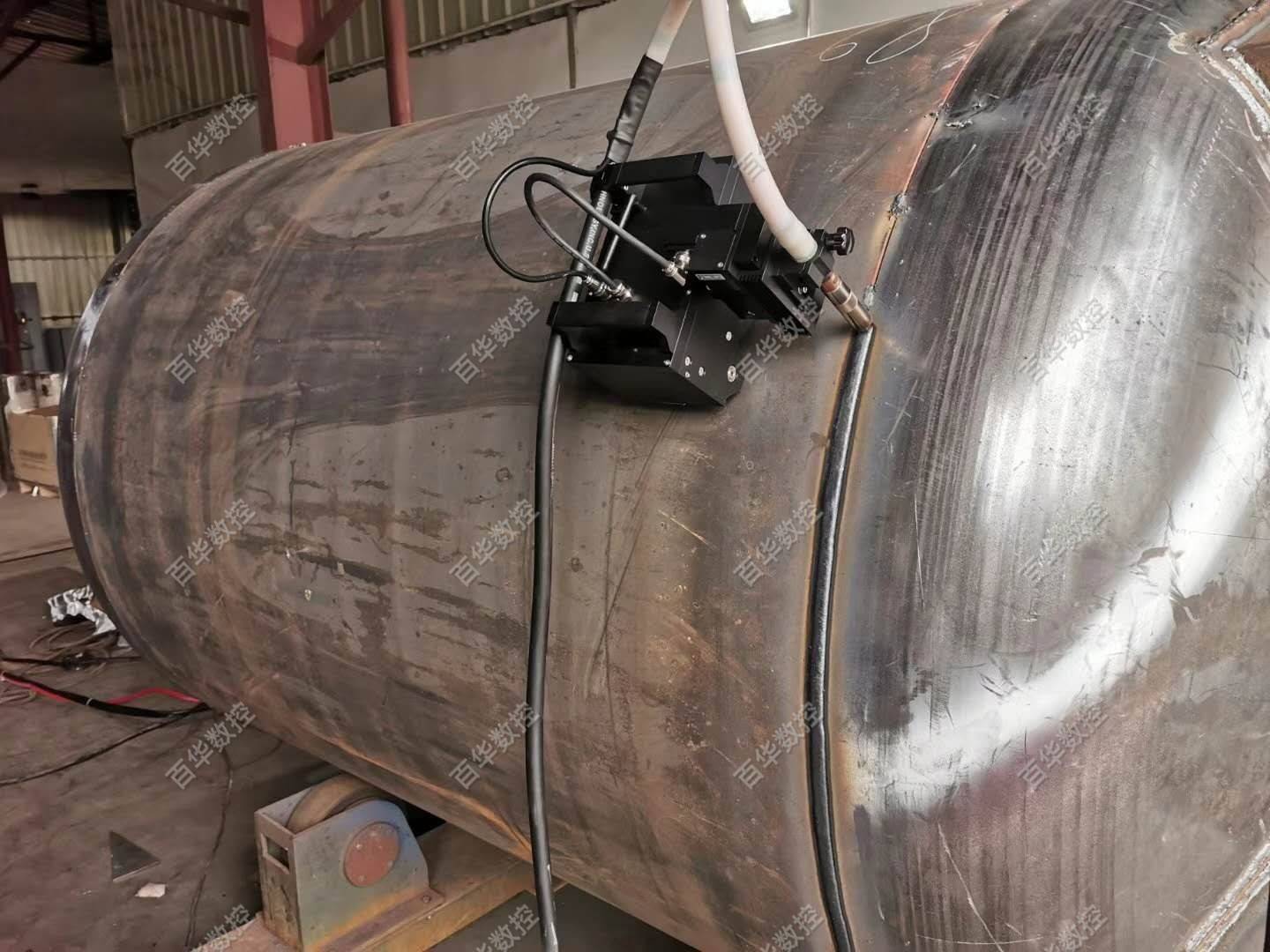 该管道及压力容器全位置焊接机器人采用工件固定不动,焊接爬行小车绕管道或压力容器的筒体圆周爬行的方式实现全位置自动焊接,同时可增加简易轨道通过爬行小车直线行走实现筒体的直缝焊接,该产品设计轻巧、集成度高、移动方便,无论厂内或露天厂外均可方便作业,广泛运用于石油、石化、化工、天然气、海工、市政、热力供暖等行业管道及压力容器的自动焊接,焊接工艺可选用熔化极气体保护焊或钨极氩弧焊。