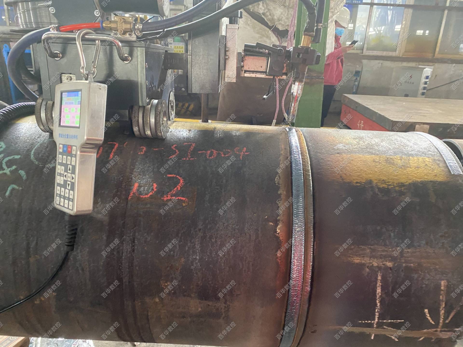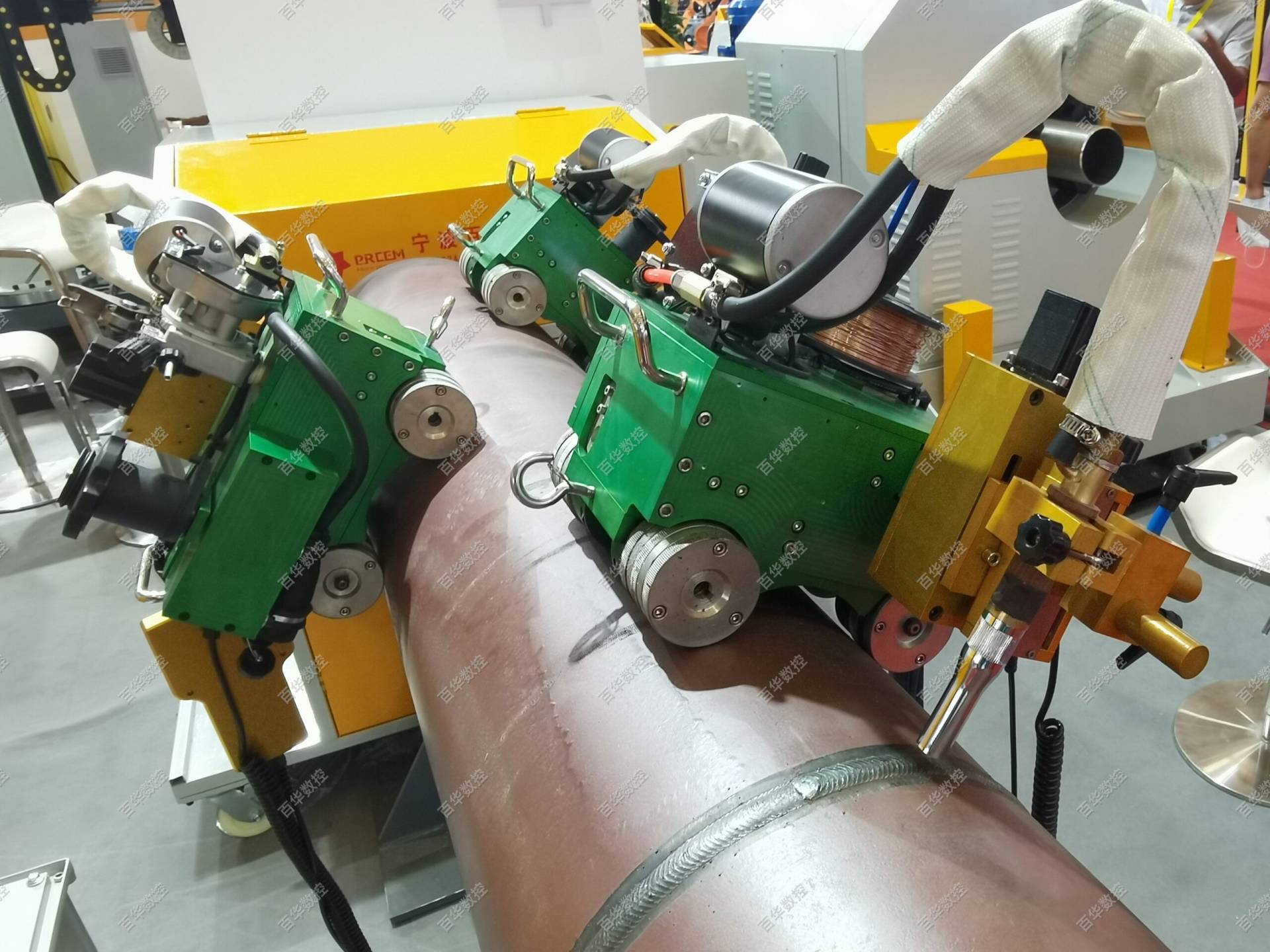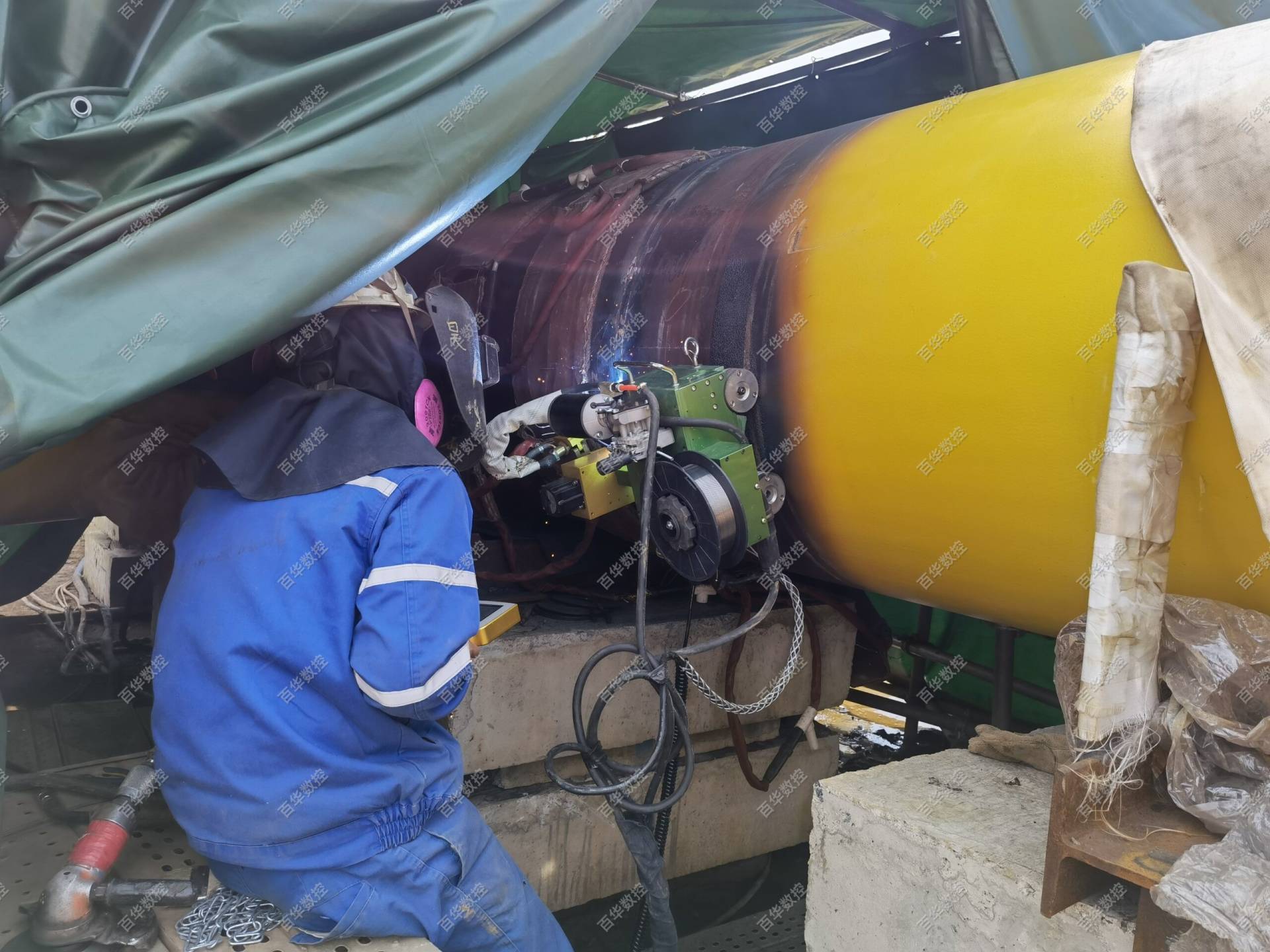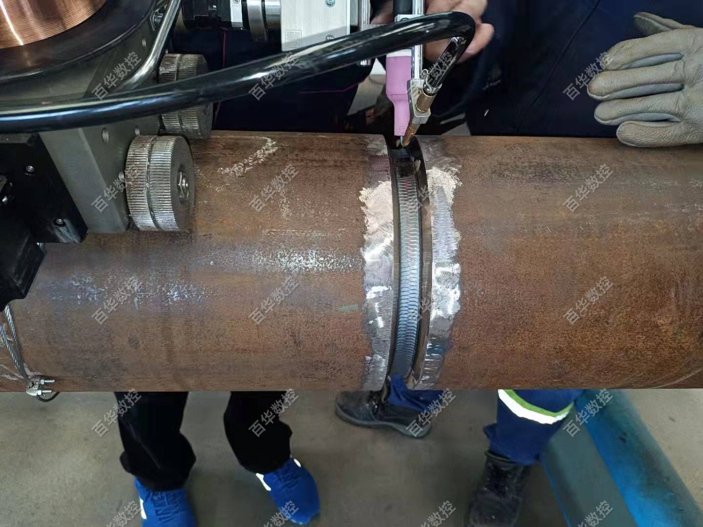 该管道及压力容器全位置焊接机器人采用工件固定不动,焊接爬行小车绕管道或压力容器的筒体圆周爬行的方式实现全位置自动焊接,同时可增加简易轨道通过爬行小车直线行走实现筒体的直缝焊接,该产品设计轻巧、集成度高、移动方便,无论厂内或露天厂外均可方便作业,广泛运用于石油、石化、化工、天然气、海工、市政、热力供暖等行业管道及压力容器的自动焊接,焊接工艺可选用熔化极气体保护焊或钨极氩弧焊。
