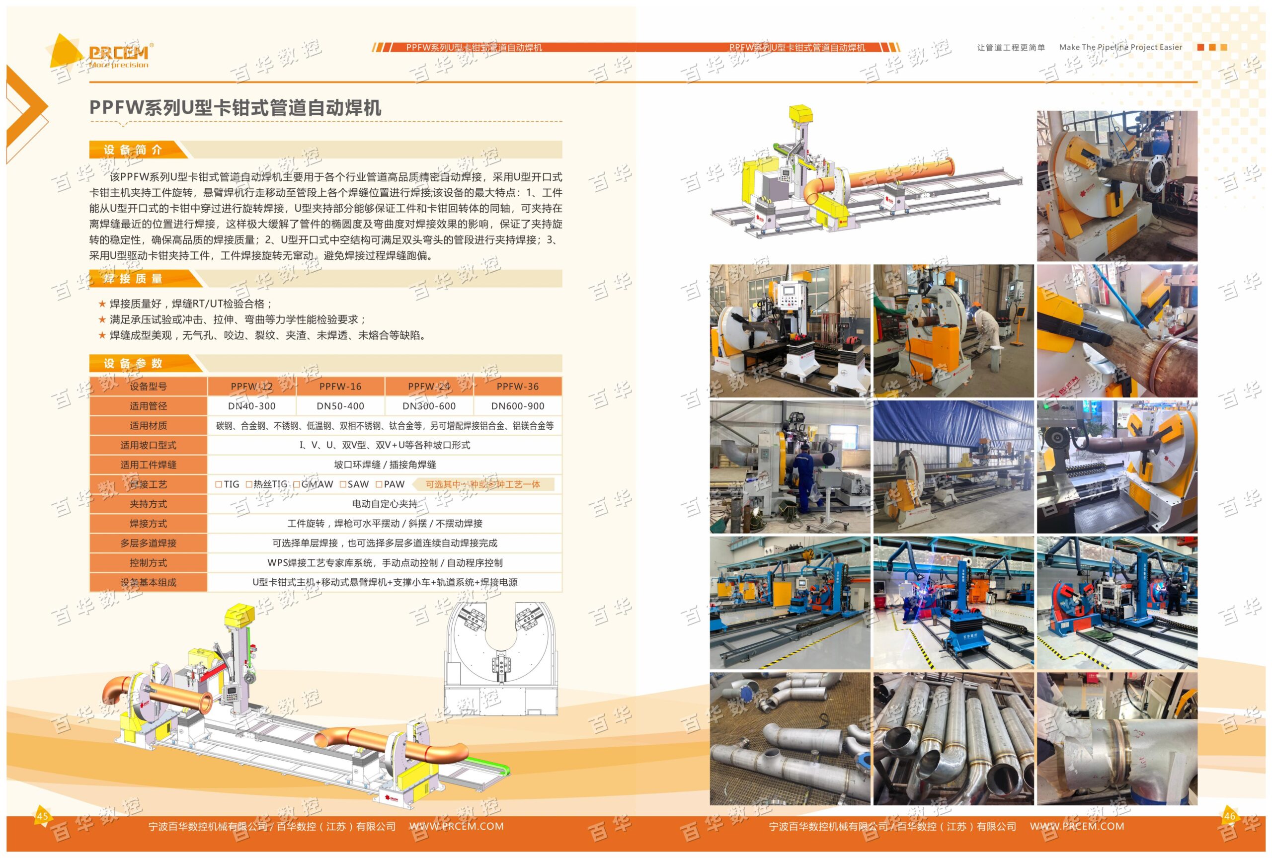 This PPFW Series U-Type Clamp Pipe Automatic Welding Machine is mainly used for high-quality, precision automatic welding of pipelines in various industries. It uses a U-shaped open clamp main unit to hold the workpiece for rotation, while the cantilever welder travels along the pipe section to each weld position for welding.
