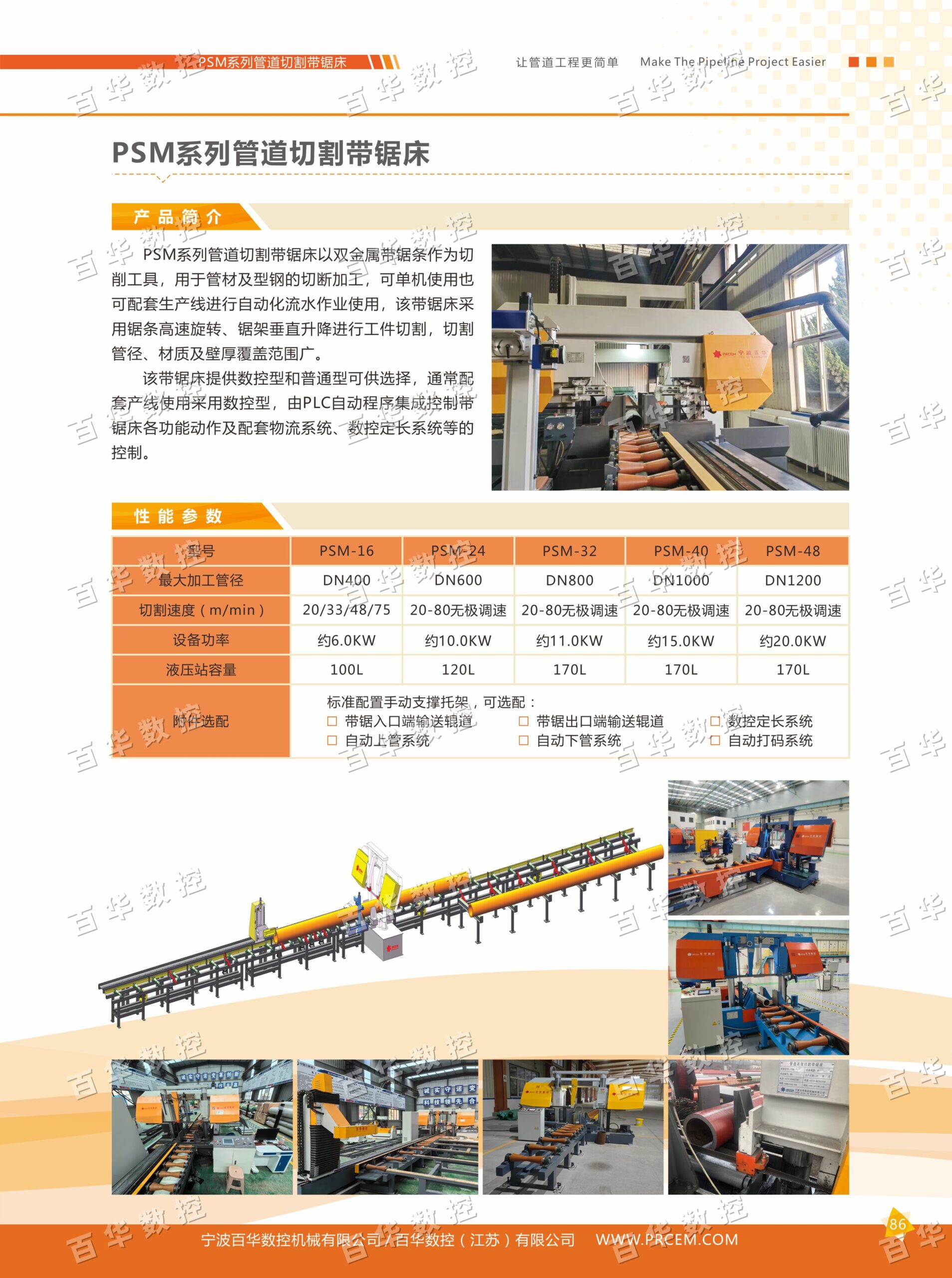 The PSM Series pipe cutting bandsaw uses bimetal bandsaw blades as the cutting tool and is used for cutting pipes and structural steel. It can be used as a standalone machine or integrated into a production line for automated continuous operation. This bandsaw cuts workpieces through high-speed blade rotation and vertical lifting of the saw frame, covering a wide range of pipe diameters, materials and wall thicknesses.